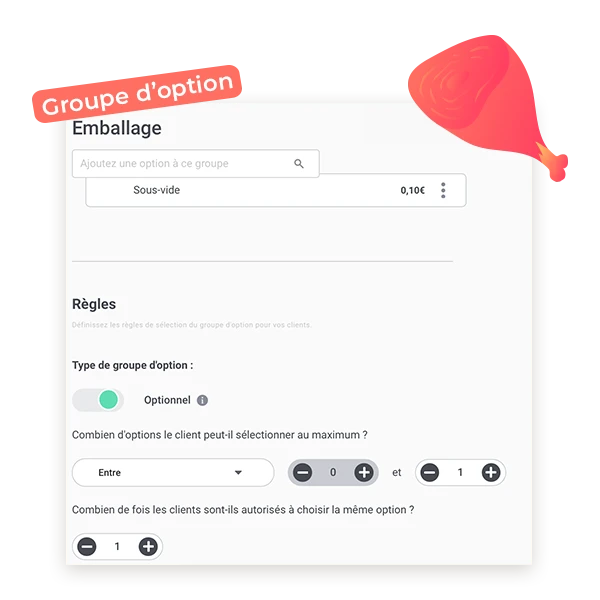 Ajoutez ensuite des options à vos groupes d’options et laissez vos clients composer leur commande comme il l’aime.
