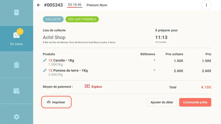 Screen sur l'application de commande en ligne Achil. Image pour montrer ou se situe le bouton pour imprimer une commande en ligne.